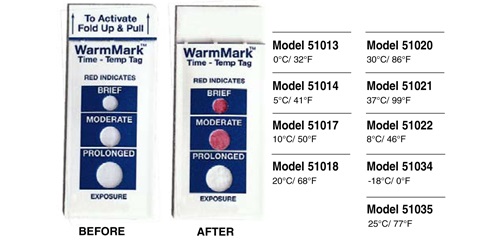 溫度指標(biāo)標(biāo)簽是體積小、成本低的溫度指示標(biāo)簽或時(shí)間/溫度標(biāo)簽,,使用于食品運(yùn)輸、儲(chǔ)存或處理過程。典型的用途包括監(jiān)測(cè)藥品、化學(xué)品和新鮮農(nóng)產(chǎn)品在運(yùn)輸過程中德溫度。如果溫度超出預(yù)設(shè)的限制之外,標(biāo)簽顯示變色。 DeltaTrak提供滿足你各種需要的標(biāo)簽:WarmMark溫度標(biāo)簽、高溫?zé)針?biāo)簽和TempDot時(shí)間溫度指示標(biāo)簽顯示溫度變 化超過預(yù)設(shè)的時(shí)間。FreezeCheck和ColdMark溫度標(biāo)簽用于顯示運(yùn)輸溫度低于0℃。商業(yè)洗碗機(jī)使用的TempDot高溫?zé)針?biāo)簽可顯示最終沖 洗水溫是否達(dá)到71℃(HACCP體系所要求的溫度)。 WarmMark 溫度標(biāo)簽,,型號(hào)51013-51035, 監(jiān)控產(chǎn)品在運(yùn)輸、 儲(chǔ)存或處理過程中的溫度。反應(yīng)溫度范圍可從-18℃至37℃。這些不干膠標(biāo)簽直接適用于產(chǎn)品、包裝、紙箱或大包裝上。一旦反應(yīng)溫度達(dá)到或超過,標(biāo)簽便被激 活而發(fā)生不可逆變色。紅色顯示溫度的閾值外暴露經(jīng)過了一個(gè)短暫,中等或長(zhǎng)久的時(shí)間段。你一眼便能看出是否有溫度閾值外暴露發(fā)生,,提供質(zhì)量保證的永久記錄。