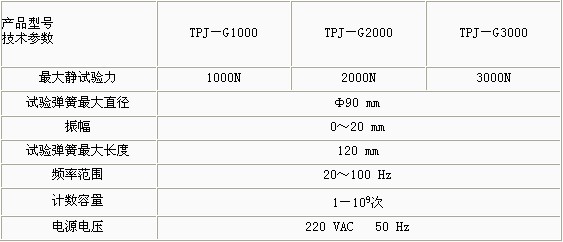 產(chǎn)品概述: TPJ-G系列彈簧高頻疲勞試驗機采用電磁激勵、試件(彈簧)共振原理,系統(tǒng)自動處于最佳諧振狀態(tài),空氣彈簧試驗,勿需調(diào)整,彈簧荷重機,起動一觸即發(fā),性能穩(wěn)定可靠。操作簡單,彈簧壓拉試驗機,操作人員勿需培訓。 功能特點: 試驗機設(shè)有振動次數(shù)及頻率的數(shù)字顯示及次數(shù)預置、記憶等功能。該機既可以做單對彈簧的試驗,也可做多對彈簧的試驗機。 技術(shù)參數(shù):
